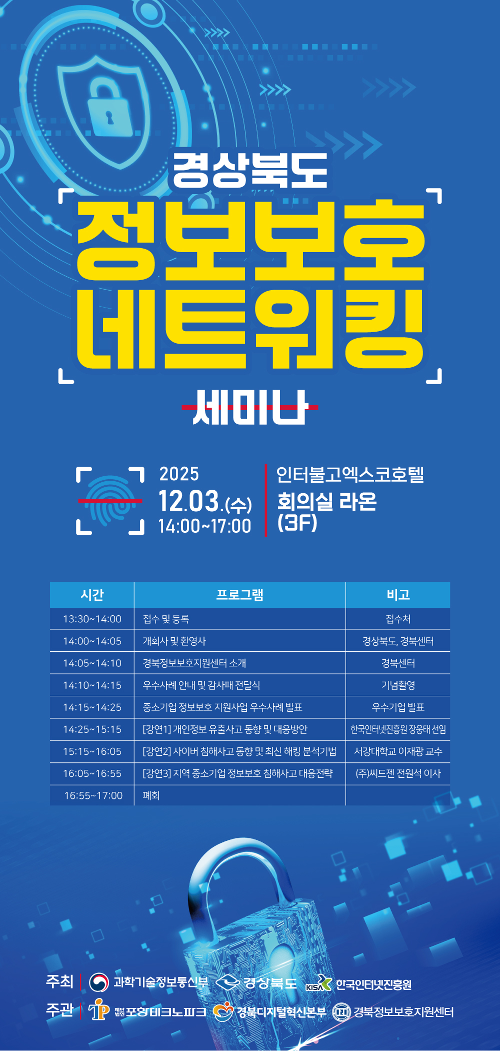 ○행사개요 -일 정 : 2025.12.03(수) 14:00~17:00 -장 소 : 대구 인터불고엑스코 호텔 라온(3F), 대구 북구 유통단지로 80 인터불고 엑스코 호텔 -참석대상 : 경상북도, 관련 전문가, 지역기업 담당자 및 대학생 등 -주요내용 : 개인정보 유출사고 동향 및 대응방안, 사이버 침해사고 동향 및 대응방안 등 -접 수 처 : 사전접수 링크(https://forms.gle/nZBVbsVceFhpfRYC6) -문 의 처 : 경북정보보호지원센터(TEL. 054-223-2297)