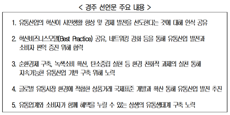 아태 지역 유통 리더, 경주에 집결 - 대한상의, ‘APEC 유통 퓨처테크포럼’서 ‘경주선언’ 이끌어 내고 실천을 다짐 (韓)롯데·GS리테일·쿠팡·현대백화점 (美)아마존, (中)징둥닷컴, 국제표준기구 GS1 등 참여 - 세계적 유통 거목 데이비드 벨 “AI시대 유통 승자는 ‘데이터·개인화·맞춤화에 집중하는 기업’이 될 것” - 글로벌 혁신기업 사례 발표… “AI·글로벌화·ESG”가 혁신과 성장의 비결